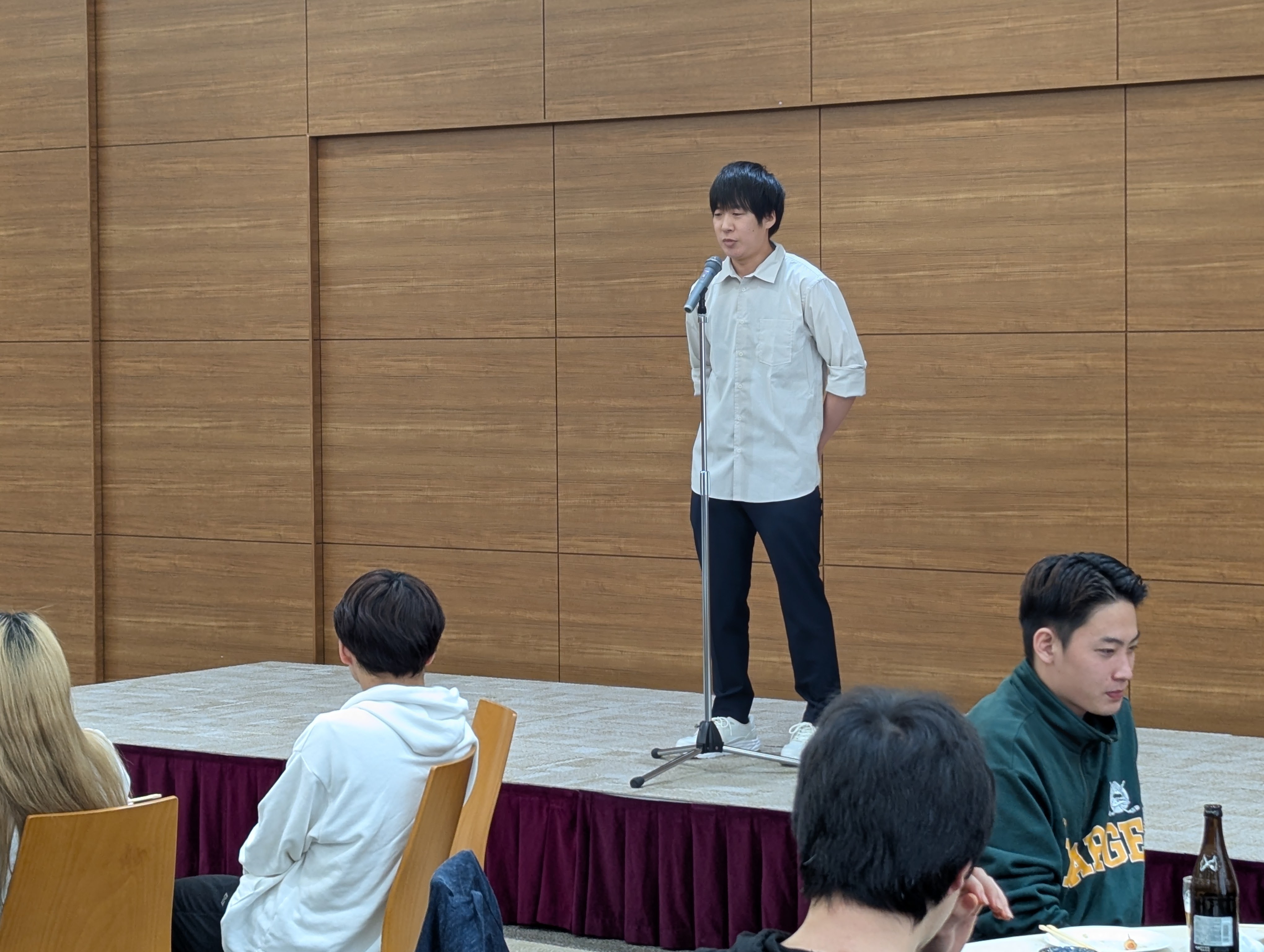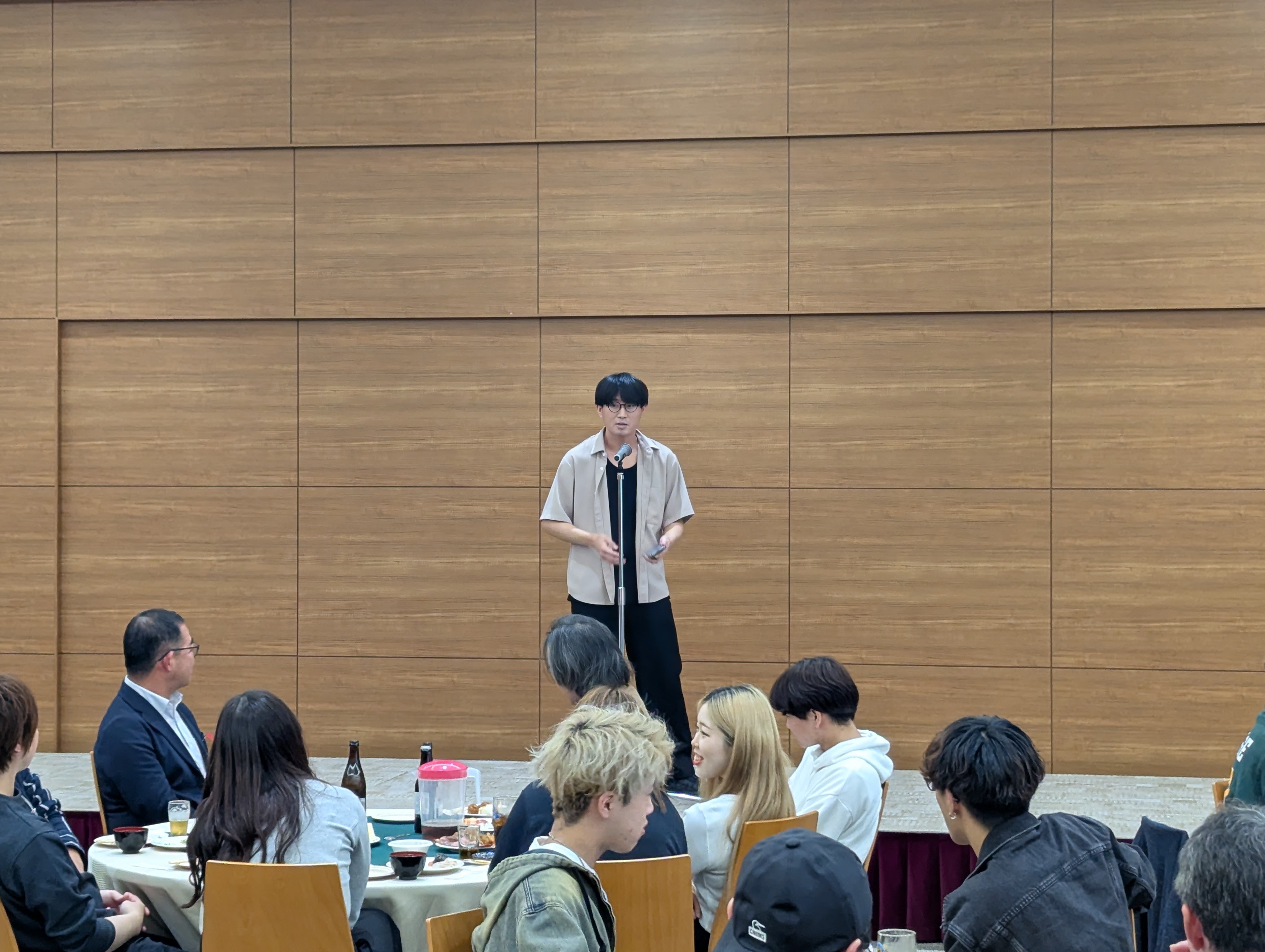 報告会後には懇親会を開催しました。(写真は従業員代表による挨拶の様子)
